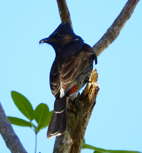 The baby bird hopped onto his arm and then onto a rock when he reached the shore. And there it sat for a long time, not moving, not even fluffing up its feathers. We worried that it might be in shock, might not survive … until an adult bird showed up, a red-vented bulbul. It fluttered around our little foundling, flew away, came back again and at last the baby flapped its wings and flew up and away, following mum (or possibly dad – male and female bulbuls look much the same to humans and share parenting duties, foraging for insects for example).