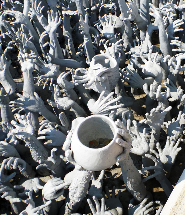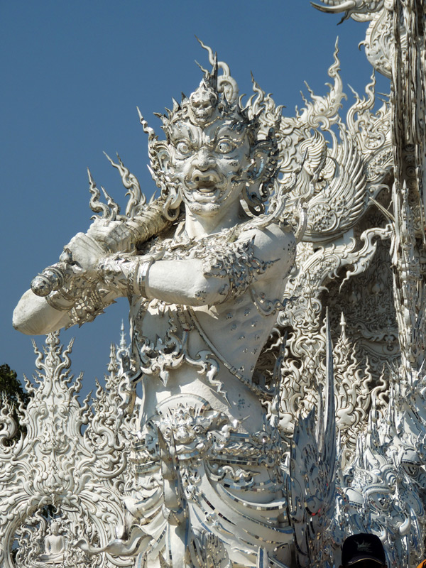 Chiang Rai, Northern Thailand – The dilapidated Wat Rong Khun on the outskirts of Chiang Rai is being rebuilt by local artist Chalermchai Kositpipat. His murals combine Buddhist themes with contemporary images and so does the new wat. It is also known as the White Temple for obvious reasons. To reach the main building, the ubosot, you cross a bridge, the Gate of Heaven, over a small lake. Every gleaming white part is ornately crafted with mythical Buddhist creatures, many the stuff of nightmares. Think Dante’s inferno in icing sugar.