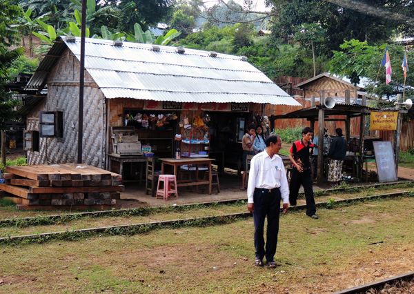 This was built as a ‘spare’ bridge in 1976 – 1978 to keep trains running even if the viaduct was sabotaged by the Shan State Army in its fight for independence. The tracks were still visible from the viaduct when we were there in 2012, but the line has been left to the tropical vegetation since 2002.